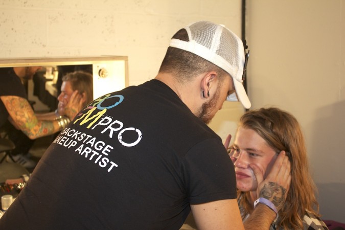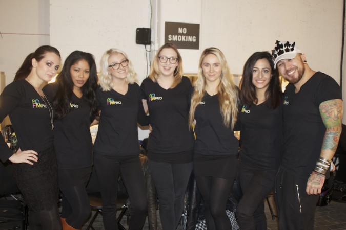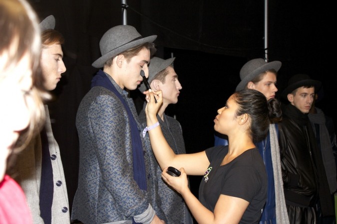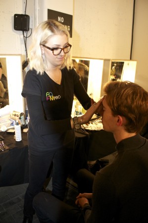 AOFM took a team of our Students to work backstage at the Designer label YMC. Our grads arrived in the late morning at the famous BFC where almost all the Men’s  Fashion shows take place. They quickly set up before being briefed on the makeup look. The skin was prepped using Dermalogica ultra calming cleanser followed by their famous multi active toner, which refreshes the skin leaving it hydrated. This was followed by a rich moisturizer and our students used skin smoothing cream by Dermalogica.  One the skin was prepped our students used a very light concealer the cover any blemishes  and dark circles. It was a minimal look but skin had to look flawless. Take a look at our Students in action!!