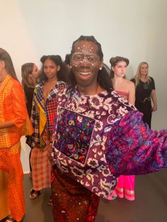 The look for MRHUAMRHUA was full of colour! This was a really fun show for our grad team, and a chance to use their blending skills and colour palettes!  To start, the skin was fully prepped with Dermalogica’s Ultra Calming Cleanser and Toner. For the female models, a lightweight dewy foundation was applied and concealer where needed. Next, the team created a colourful deconstructed, smokey eye in various shades of pink, red, orange and yellow. A soft blossom-coloured blush was applied to the cheeks, and the look was finished was a peachy-nude lipgloss. For the male models, skin was left natural with pinpoint concealer where necessary. The top lip was lined with black kohl and curled out at the corners to look like a moustache.