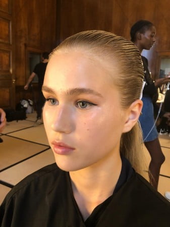 Our grads joined their key artist backstage at Goldsmiths Hall, in Covent Garden for their mid afternoon call time, the breif the day was total simplicity, glowy skin, a nude lip and a little liner to give definition to the eye. The grads are old pro’s in the fashion week classic look, so it was with total confidence that they began to work their way through tbe 18 beautiful models with ease.
