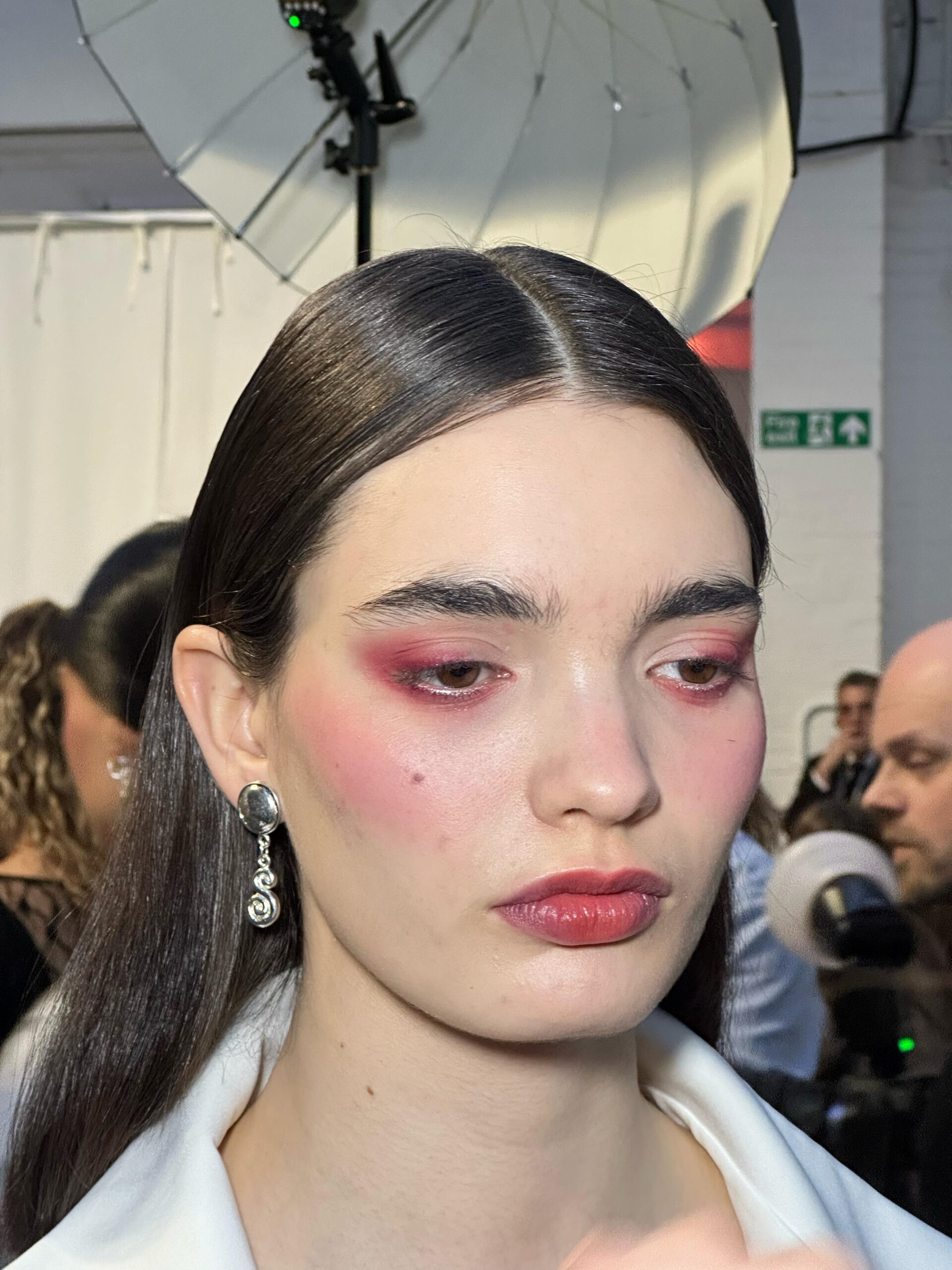 To maintain balance, artists swept rose-toned cream blush high across the cheekbones and echoed the same tint on the lips, tapping pigment in with fingertips for a natural, stained finish.