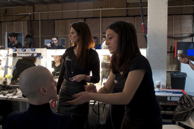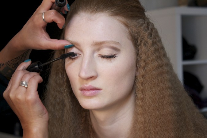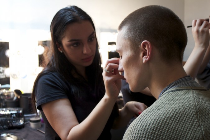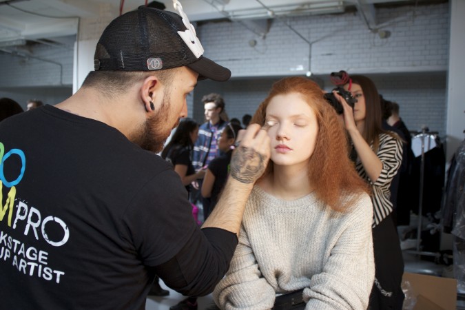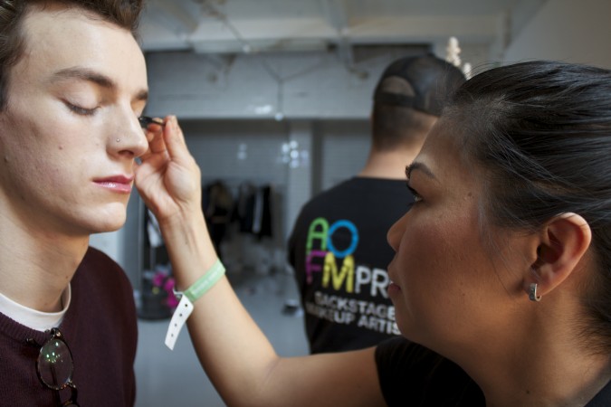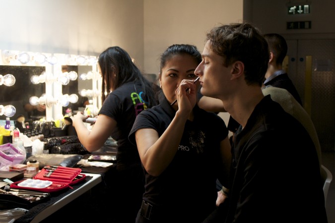 AOFM were once again honored to head the makeup team for London based designer duo Baartmans and Seigel. The Dutch/English collaboration is renowned for their modern wearable luxury. A premium brand with imaginative craftsmanship at its core. Two lucky graduates headed back stage at London’s Victoria House, where they completed this seasons look of minimal natural makeup to harmonise with the designers new collection of sharp tailored jackets coupled with wearable free flowing sports wear; taking the concept of smart /casual up a level! Our grads cheived this look by cleansing the skin with Dermalogica Ultra Calming Cleanser, followed by dermal exfoliation using Dermalogica Microfoliant to achieve an smooth surface. The Models skin was hydrated using Dermalogica Active Moist Cream. The lips were moisturised using an artist fav, Hemeoplastine Ointment. Minimal amounts of MAC Pallet concealer was buffed into the skin to create an even tone. The brows were brushed and groomed upwards using MAC brow gels. , finished by a dusting of translucent MAC set powder.  There were also female models in the show who had a more heavier look applied to them. Shu Uemura foundation was buffed into the skin for a dewy look. on the eyes a light colored paint pot from mac was used  all over the mobile eye lid and was then defined with a brown eye shadow  in the crease of the socket. A good coat of mascara was applied to both top and bottom lasged using Hypnoise by Lancome. Lips were kept nude with a hint of lipstick applied.  Cheeks were contoured and a very small amount of blush was used as the look needed to be kept to the Autumn\Winter look.