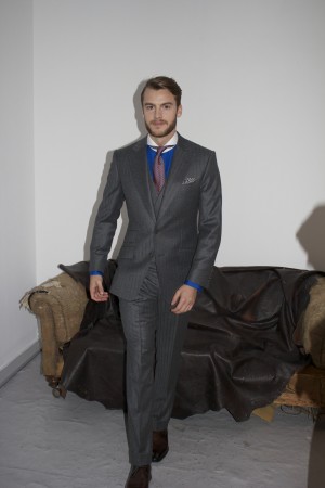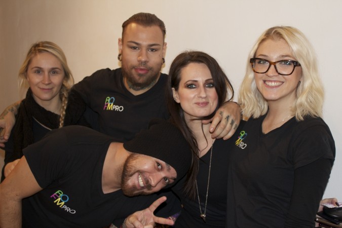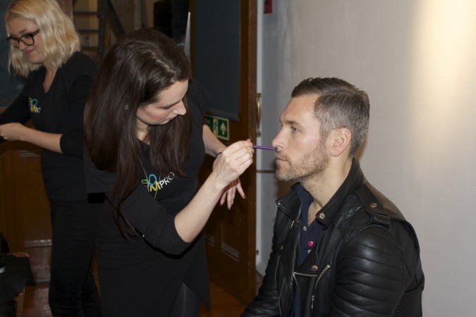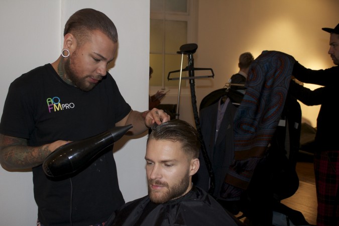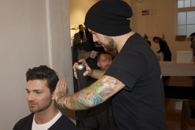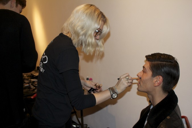 AOFM took a team of Graduates to work backstage on all grooming on Chester Barrie. Chester first established his luxury line in London’s famous Savile Row . He was the first designer on Savile Row to create ready to wear tailoring. It was a great honor for AOFM to be working with such a great designer. Our Grads prepped the skin using Dermalogica Skin care. Skin smoothing cream by Dermalogica was applied on the skin to moisturize. Lips were moisturized by using lucas paw paw ointment which is fantastic for chapped lips especially in this season! Bobbi Brown foundation stick were used to cover any imperfections and applied very lightly. Brows were combed through and translucent powder was applied in the t-zone areas.