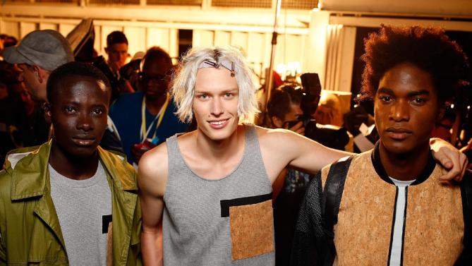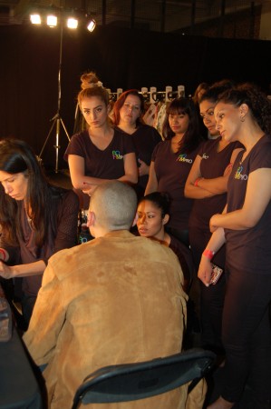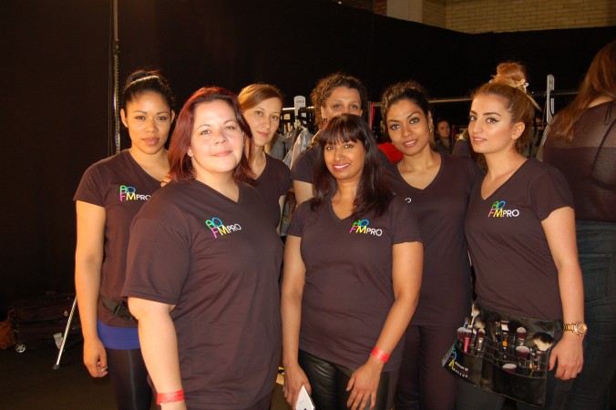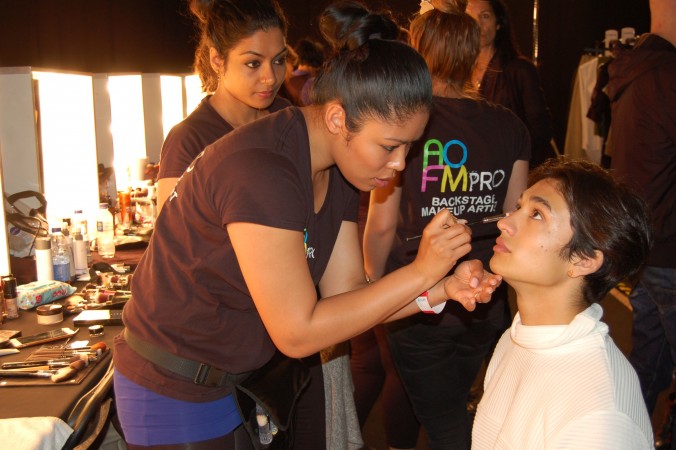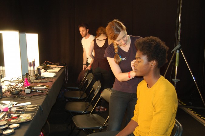 Aofm Graduates met and set up for the show at The Old Sorting Office. With a raw, gritty finish it is the perfect setting for edgy Christopher Raeburn. The show was called Borneo and statement backpacks were stars of the show. The team were briefed to give the skin a very clean, minimal matte finish. To achieve this they prepped the skin first with Dermalogica skin care then applied Mac face and body to the areas that needed it. A concealer was used too if there was particular darkness around the eyes. finishing the look, all that was required was a very small, light dusting of setting powder to avoid a heavy, obvious makeup look.