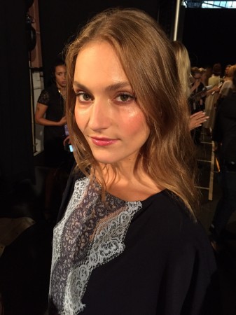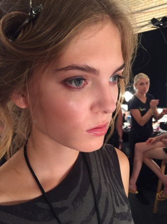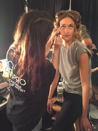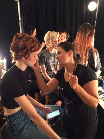 AOFMPro were invited to work backstage during New York Fashion Week at the Erin Fetherston Spring/Summer ’16 show. The collection was a very feminine take on the current trend of the 1970’s and had a very refined boho feel to it. The collection’s inspiration was from French 1960’s songstress/actress Jane Birkin and Anne of Green Gables. The makeup and hair also had a very boho feel to it with lots of middle partings and soft waves framing the face and the makeup applied by AOFMPro lead makeup artist and our amazing AOFM graduates was kept very light with the emphasis on flushed cheeks this meant lots of blusher was applied and a clear shine was used to emphasize the cheek bones instead of the usual highlighter. Take a look at some of our pictures to see our graduates working very hard backstage and the beautiful finished look on the catwalk.