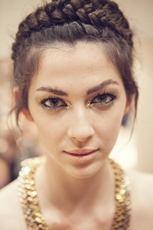 The designer, Jasper Garvida loved the idea of a Cleopatra-inspired eye, so the AOFM graduates including lead make up artist Sasha O’Neill created a gorgeous golden eye using metallic pigment, which was embellished with gold leaf on the inner corner of the eye applied with Paw Paw, which really popped on the runway. The liner was kept soft and smudgy, with a simple coat of mascara to finish off the eye. Skin was kept clean and dewy looking, with a light dusting of Charlotte Tilbury Filmstar Bronze & Glow highlighter on the tops of the cheekbones and cupids bow. The makeup look was recreated by the AOFM Pro Team on the models – resulting in a beautiful show.