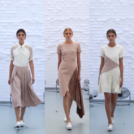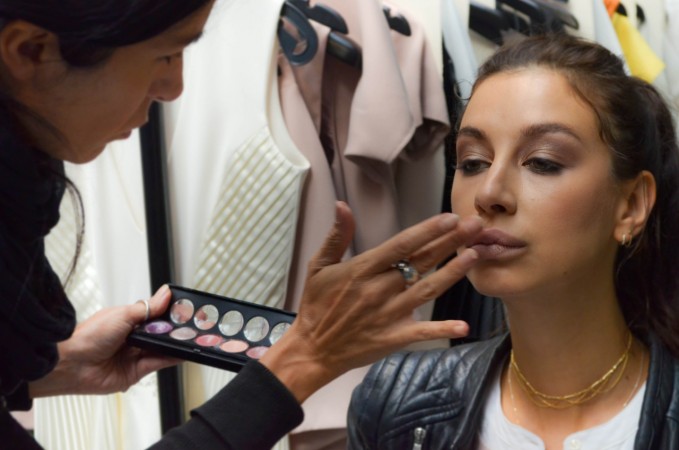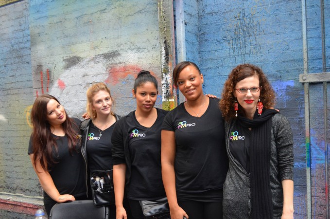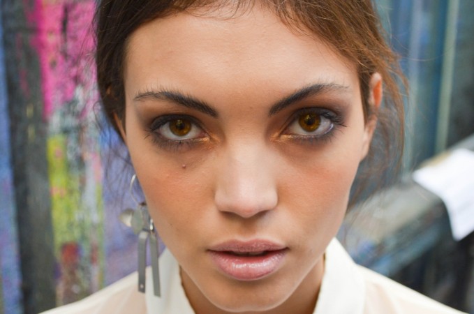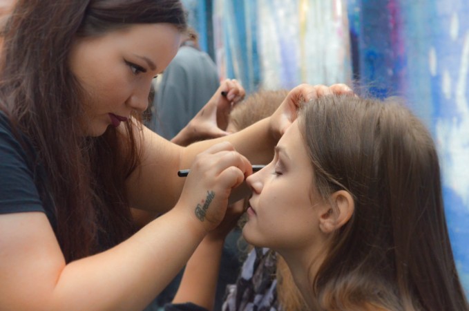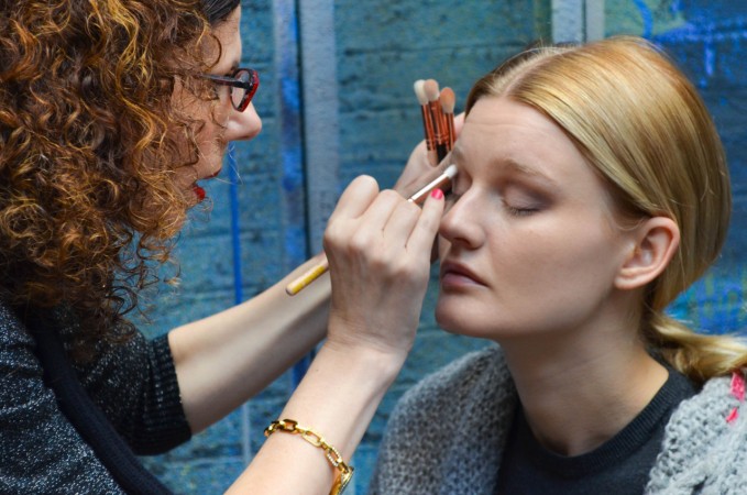 Georgia is known for creating structural designs that are both abstract and feminine. Creating a look that both compliments and fits to her creations is far from a walk in the park. But, as you can see in the pictures, AOFMpro graduates nailed it. The beautiful dresses and the creatively designed white paper background felt like a little fashion world on its own. A feeling that made it easy to fall in love with the show! The designs where sophisticated and romantic at the same time. The whole team did an excellent job in making it an all-round success. The make up look applied by our talented team of graduates was influenced by the 1970’s using ivory, yellow and deep orange. For the eyes, different shades of metallic brown and orange were used especially in the inner corner of the eyes. Black eyeliner on the upper and lower rim and black mascara. For shading of the skin shades of taupe were used and bronzer on the cheekbones. A nude lipstick was used with clear gloss over the top. Take a look at our amazing graduates at work and the finished makeup look for the show