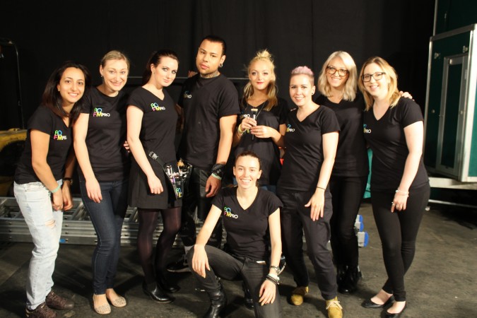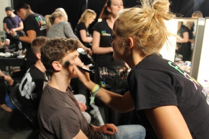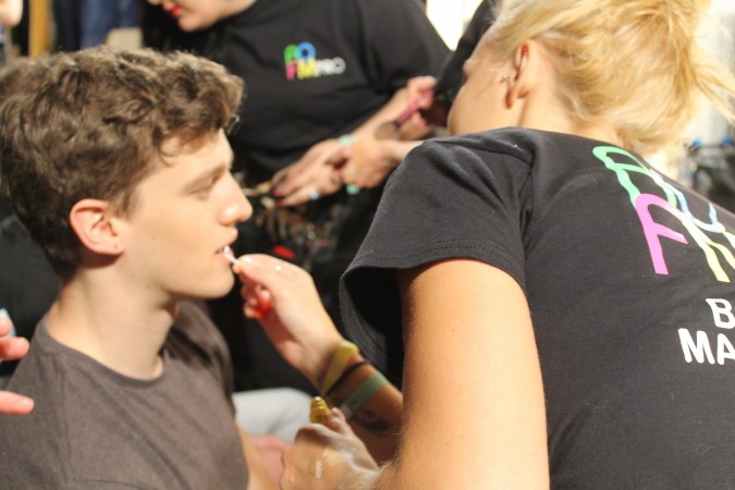 AOFM graduates had an early call time in the morning, working backstage at London Collections: Men for KTZ. The collection was in orange, black and white, inspired by ancient Greek vases. The make-up look was bronzed, urban warriors! Skin was prepped using Dermalogica and lips were moisturised before tinted mosituriser was applied to the face. Concealer was used where necessary and eyebrows were brushed through. Bronzer was used to finish off the look. The setting of the Old Sorting Office helped create an electric atmosphere backstage.
