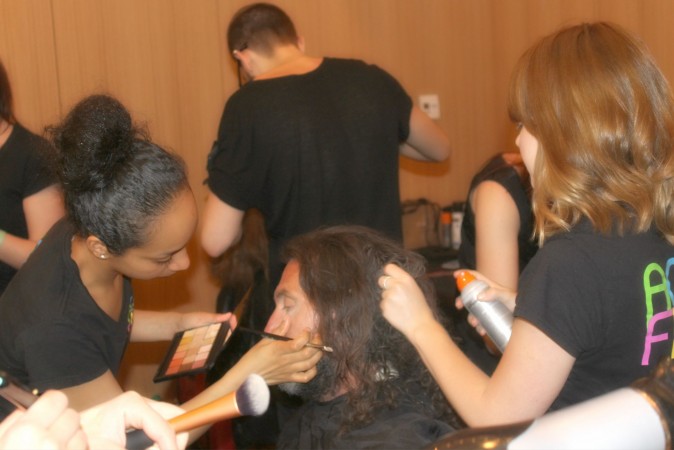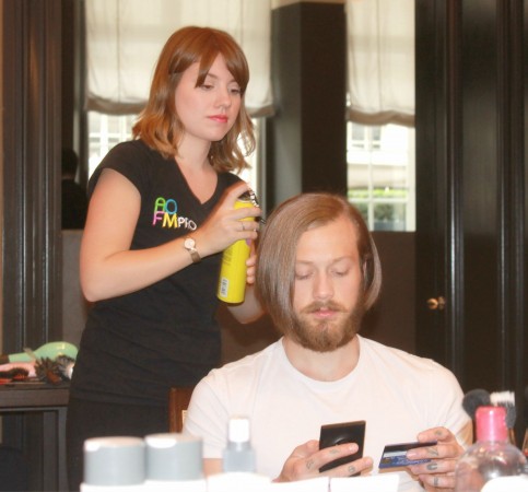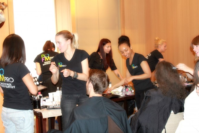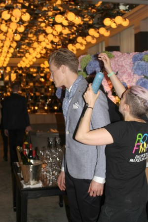 The setting for luxury menswear brand Duchamp was the magnificent Rosewood Hotel. The collection was based on British Heritage, Creative Back Tie and Contemporary Riviera. AOFM graduates created the hair and makeup backstage. Make-up was very minimal with concealer being used to cover any dark circles or blemishes on the skin. Eyebrows were brushed through and lips well moisturised, but not left shiny. AOFM Grads also did the hair for the show. The hair was made to look very aristocratic and gentleman like keeping with the attire.