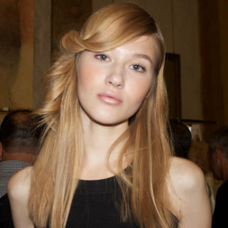 AOFMPro graduates last show for the Milan SS16 season was the Sergai Grinko show who we have worked with for the last few Milan Fashion Week seasons, his shows are always very energetic and exciting so we were all really looking forward to the show. The venue was once again the very beautiful Museo Del Novocentre in the Piazza del Duomo. This season’s collection titled “Non Conformist” was inspired by George Sand the mother of all nonconformist people. The basic shape of the collection was the circle as an egg/sun and every dress was reminded of those shapes. There was a revisitation of some Pierre Cardin inspiring models from the early 70’s mashed up with 90’s techno and minimal expressions. Fabrics used, transparent crepe de chine to light exclusive brocades. Colours were yellow, grey, black and green. The 90’s Nirvana girl was the inspiration behind the Grinko Spring Summer 16 makeup, super dewy skin, bronzed contour and excessively highlighted skin, baby nude semi gloss lips and layer upon layer of black mascara was added to the lashes. It all came together beautifully in what was once again a very exciting show for our very talented graduates to be a part of.