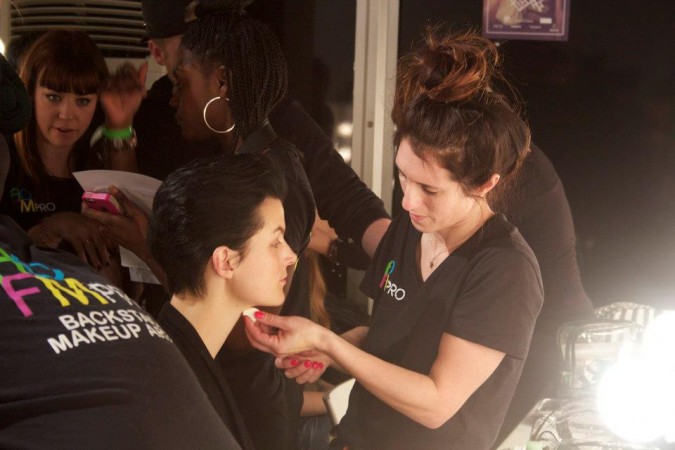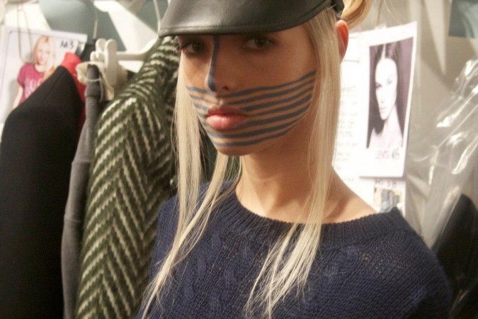 AOFM grads headed backstage once again for one of the 18 on-schedule London Fashion Week shows they were supporting at Somerset House. This time it was Haizhen Wang. The makeup was bold and applied by our graduates using stencils over the face to make the look dramatic.