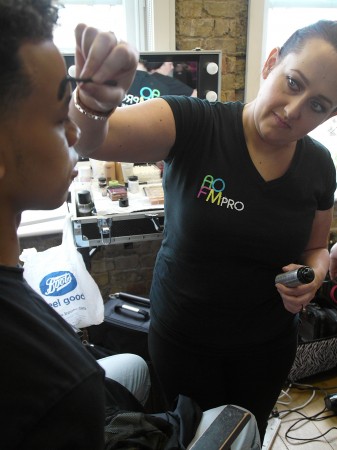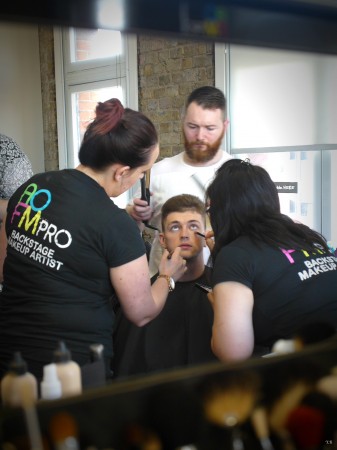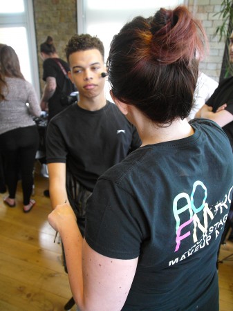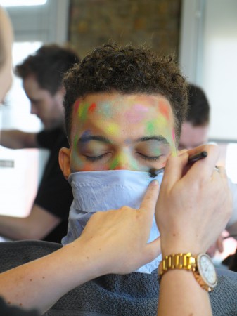 Joseph Turvey is a new, young british menswear designer. He uses his hand drawn illustrations to create unique prints and applies them to luxe sports wear silhouettes. Each collection Joseph experiments with printing, embroidery and in particular fabric and colour manipulation and SS16 has proved no exception. The makeup from this season has been inspired by the soldiers of war. With a strong camouflage military vibe using greens, black & blue the models reminds the viewer of the physical toil of war with half painted faces or goggle marks as if the “model army” had just removed their protective hat or scarf. Powdery pigments were manually smeared across the face by our graduates. Finger marks were visible and a dusting of colour used to commence the look.