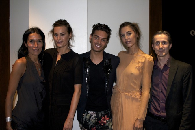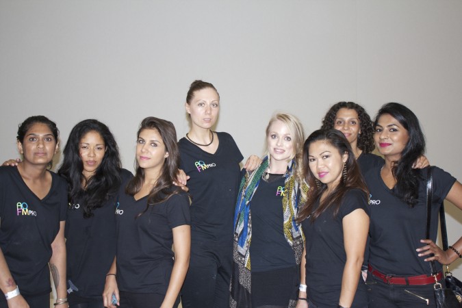 We took our AOFM grads back again this season to work backstage doing the makeup for designer Gyunel. After last seasons great appearance on the catwalk from supermodel Coco Rocha this season our grads got to work with none other than super model Yasmin Le Bon her her gorgeous daughter Amber. The makeup look was kept simple with more emphasis on the lips. A dark purple brow was used on the lips and skin was kept dewy and glowing. Our grads had a great time backstage and enjoyed the atmosphere. Check out the great designs by Gyunel and the head of education and director of AOFM with Yasmin and Amber.