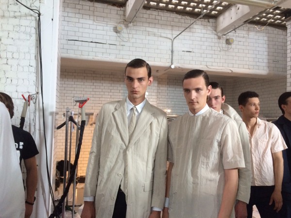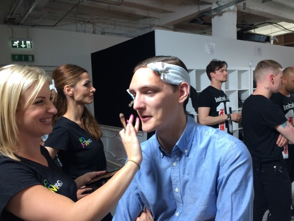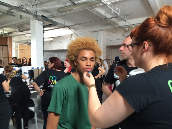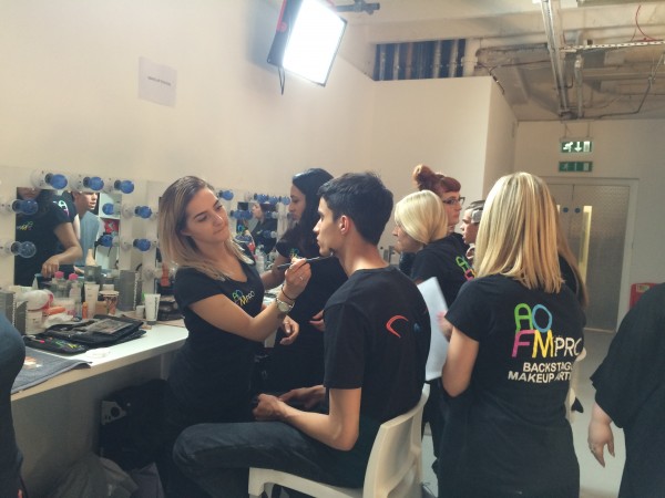 Our AOFM team were delighted to be invited once again to be the exclusive makeup artists backstage for our regular client Matthew Miller’s London Collections Mens SS16 show. The show was again held in the very beautiful Victoria House which perfectly showcased Matthew’s “Conform / Control / Restraint” collection modelled by both androgynous looking boys and girls. The colours of the collection were all very neutral and this was also reflected in the overall makeup look which was to be minimal with a matte finish. Firstly the models skin was prepped using Dermalogica ultra calming cleanser and then Dermalogica Active Moist moisturiser was used to hydrate the skin. Dermalogica’s redness relief primer was then used which helps to balance the skin tone. To achieve a matte finish a mattifying gel was applied to the skin. Concealer was used to cover any blemishes and a light dusting of translucent powder to eradicate any shine and to achieve the finished look. Take a look at the pictures of our amazing AOFM grads at work!