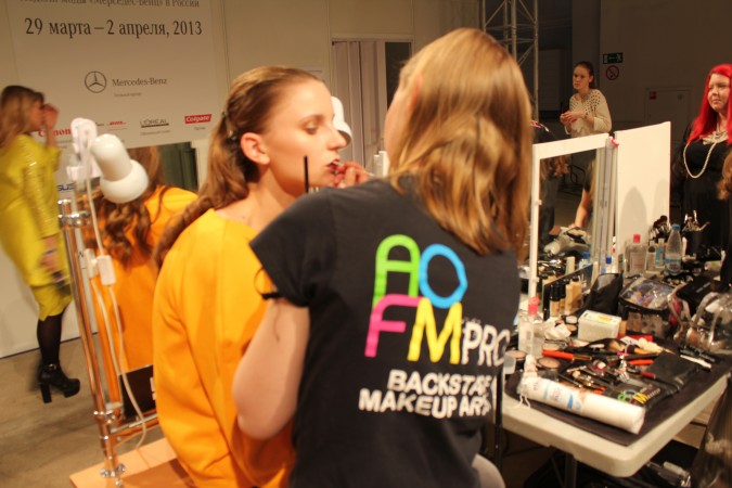 Another Fashion Week success for AOFM!  The AOFM Pro team and AOFM graduates packed their makeup kits and flew out to Moscow, Russia.  AOFM has worked with the design duo behind brand, Fyodor Golan season after season and this year were asked to head the makeup backstage for Mercedes-Benz Fashion Week Russia.  And as per usual, created some very iconic and creative makeup looks.  Eight lucky graduates were given the spectacular opportunity to work alongside makeup guru, Michelle Webb and one of the world’s up and coming designers.