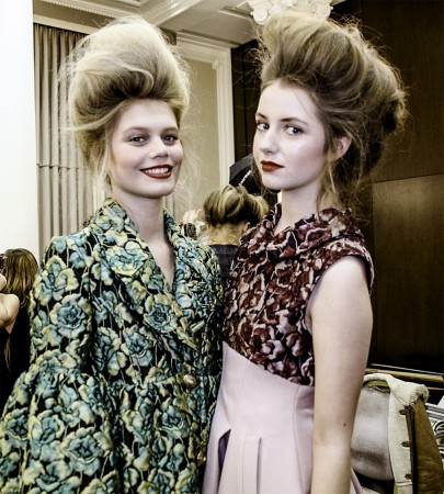 The AOFM students arrived at the beautiful Waldorf Hilton for this season’s show. The Team set up their tables and split into make-up and nail teams ready to make over the models. The nails where given a shiny red finish to compliment the striking matching lip. The Makeup look this season was flawless fresh-faced skin with retro red lips to match the retro behive-esque hair. The graduates achieved this make-up look by cleansing the skin with Dermalogica Ultra Calming Cleanser, followed by Dermalogica Microfoliant which exfoliates the skin to give a smooth blemish free surface. The models’ skin was then hydrated using Dermalogica Active Moist Cream, and a Bobbi Brown body moisturizer was applied to the legs to leave them smooth and ready for that catwalk glide.