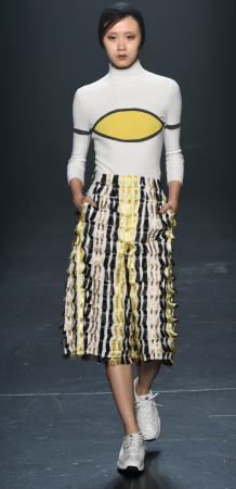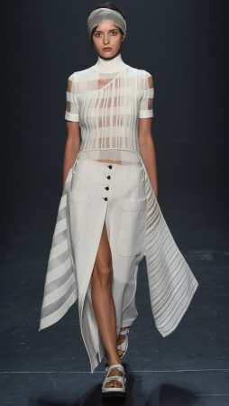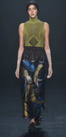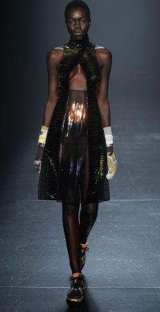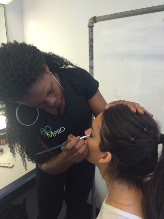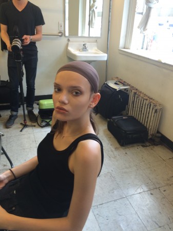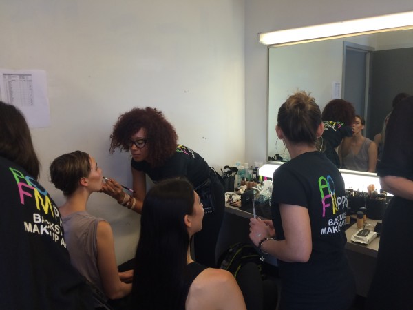 AOFMPro working for the first time backstage with new label Phelan debuting at this years New York Fashion Week. Former Alexander Wang knitwear designer Amanda Phelan launched her label this year at the La Mama theatre using models and dancers in her collection. Movement is key to her brand’s identity which is why she used dancers as well for her first collection. The collections plainest expression was via the knitwear, which displayed an impressive level of technical invention. Knitwear was popcorned and puckered, gossamer sheer, and others graphically patterned. Aside from a few pieces they were street-ready, commercial looks. The clothes featured advanced technical details such as wrapped reflective yarn stitched and gathered into 3-D sculptural formations. The makeup look which complimented the collection beautifully was to be very haunted, all of the makeup was applied by our wonderfully talented graduates. The skin was kept very natural and had to be very hydrated and super sheer. Concealer and a very small amount of foundation was used, illuminator was applied in the corner of the eyes and on the cheekbones. No mascara and very sheer lips.