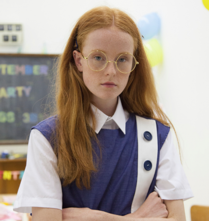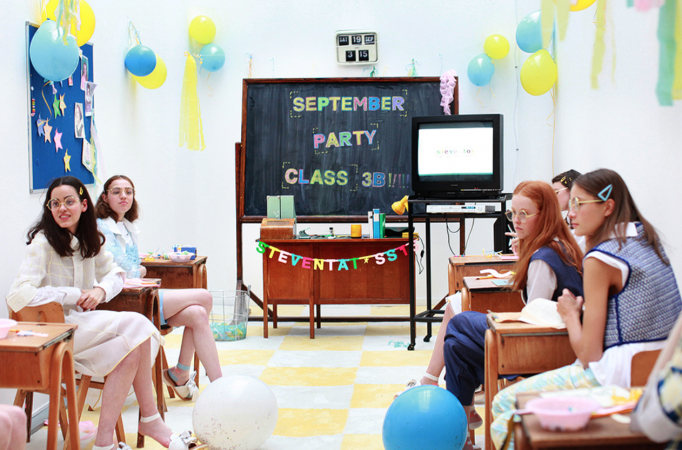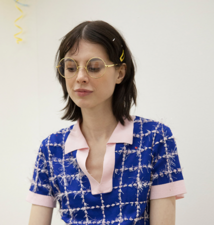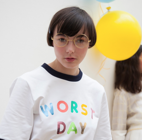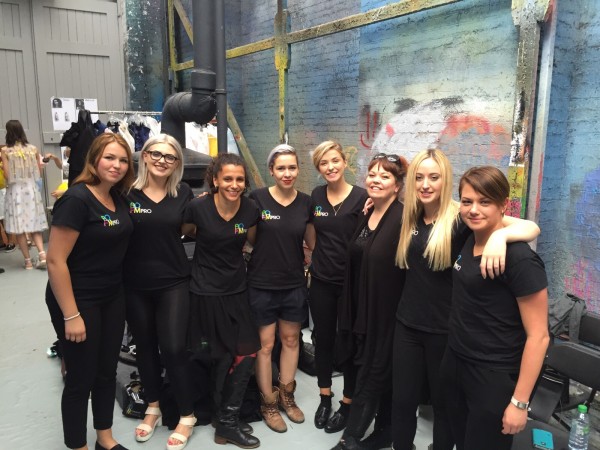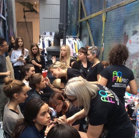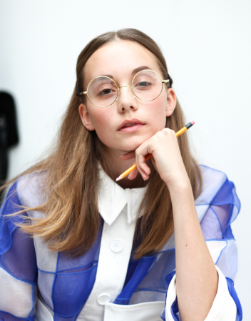 Steven Tai’s SS16 collection paid tribute to the awkward girl at school by telling her story albeit with a spot of sarcastic humour and his ever present signature touch of fun. There was a culotte trouser suit to a silver, semi-transparent organza circular skirt with smock detailing and butterfly detailing. Tai deliberately chose to not jump on the geek chic bandwagon which seems to be very en trend at the moment but instead embraces the awkwardness that is ever present within the academic world. Shades of blue, yellow and pink were the primary colours, designed with structural geometry and layered soft touches of lace and ribbon. For the makeup by our amazing graduates the skin was left as natural as possible which is very evident in the photos, concealer was pinpointed as necessary. There was a warm peach pop on the apple of the cheek and a warm peach was used on the eyes. On the lips a clear lip gloss was used and clear mascara on the brows.