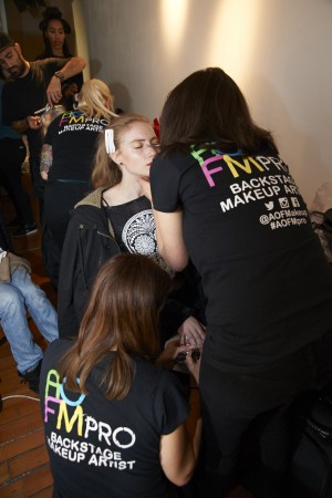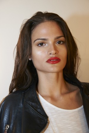Super young dewy skin was achieved by using Dermalogica Skin Smoothing lotion with a little MAC Strobe cream mixed in. Minimal powdering, only under the eyes or over pin-point concealing, to set. Tom Ford cream contour in dark, gently tapped under the cheek to create a completely skin-finish shadow. Eyes were a demure sweep of MAC paint pot in Constructivist over the entire lid and softly finished underneath in the same product. The tiniest placement of mascara on middle top lash just to open up the eye and continue that wide-eyed beauty look. The lips were created with an intense application of Bobbi Brown Jenna lip cream with an overlay of MACs lipglass, giving a highly polished finish.