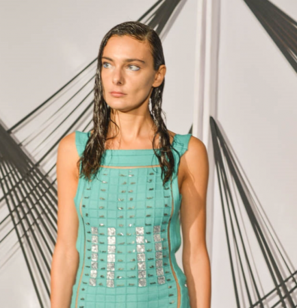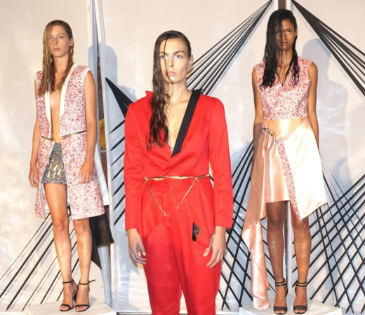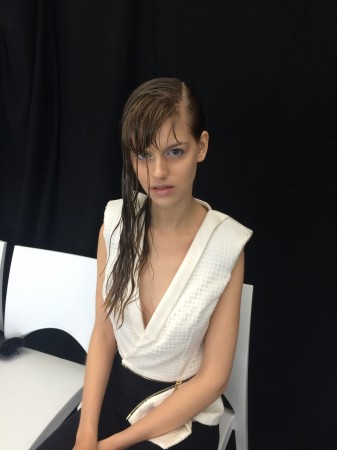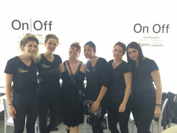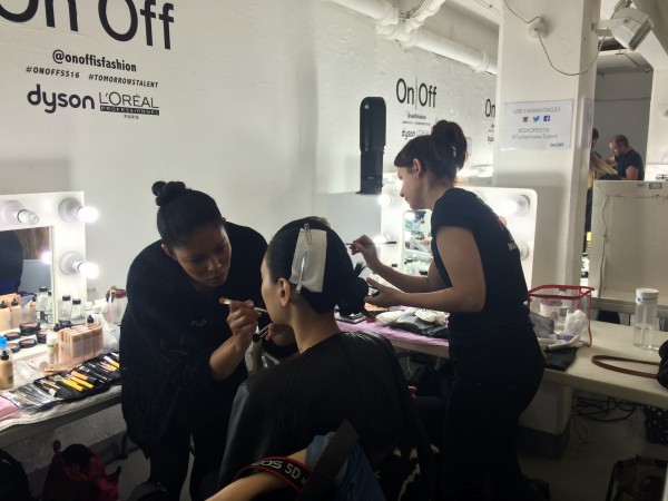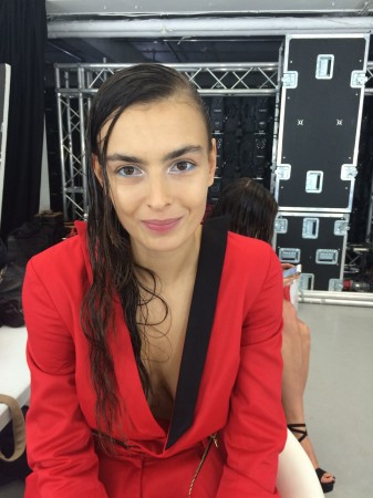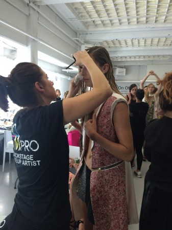 AOFMPro’s last show at this years London Fashion Week SS16 was the Wilson PK presentation at the ON/Off Studios. The collection was titled “Paradise Lost” and used lots of waves of texture and colour. Key colours in the collection included vanilla cream, emerald green, navy, peach and tangerine on cotton knit tops, flared pants, cocktail and floor length dresses. Makeup was applied by our graduates and the look was dewy/wet skin using a cream/wax based foundation. No powder but a cream highlighter was used. PawPaw was used in the brow and on the lip. For the eyes a silver/blue ombre eyeliner was used with silver in the inner eye corner.